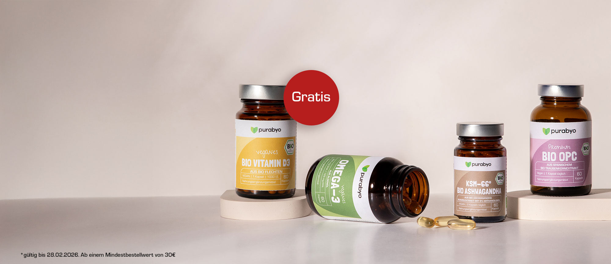 Purabyo setzt auf natürliche Mikronährstoffe in ihrer ursprünglichen pflanzlichen Matrix – statt isolierter, synthetischer Zusätze. Unsere Produkte enthalten Extrakte aus Pflanzen, Algen und Früchten, die reich an Vitaminen, Mineralien und sekundären Pflanzenstoffen sind. Zudem sind sie 100% vegan, laborgeprüft, ohne unnötige Zusatzstoffe und größtenteils in Bio-Qualität – abgefüllt in nachhaltigen Braunglasflaschen.