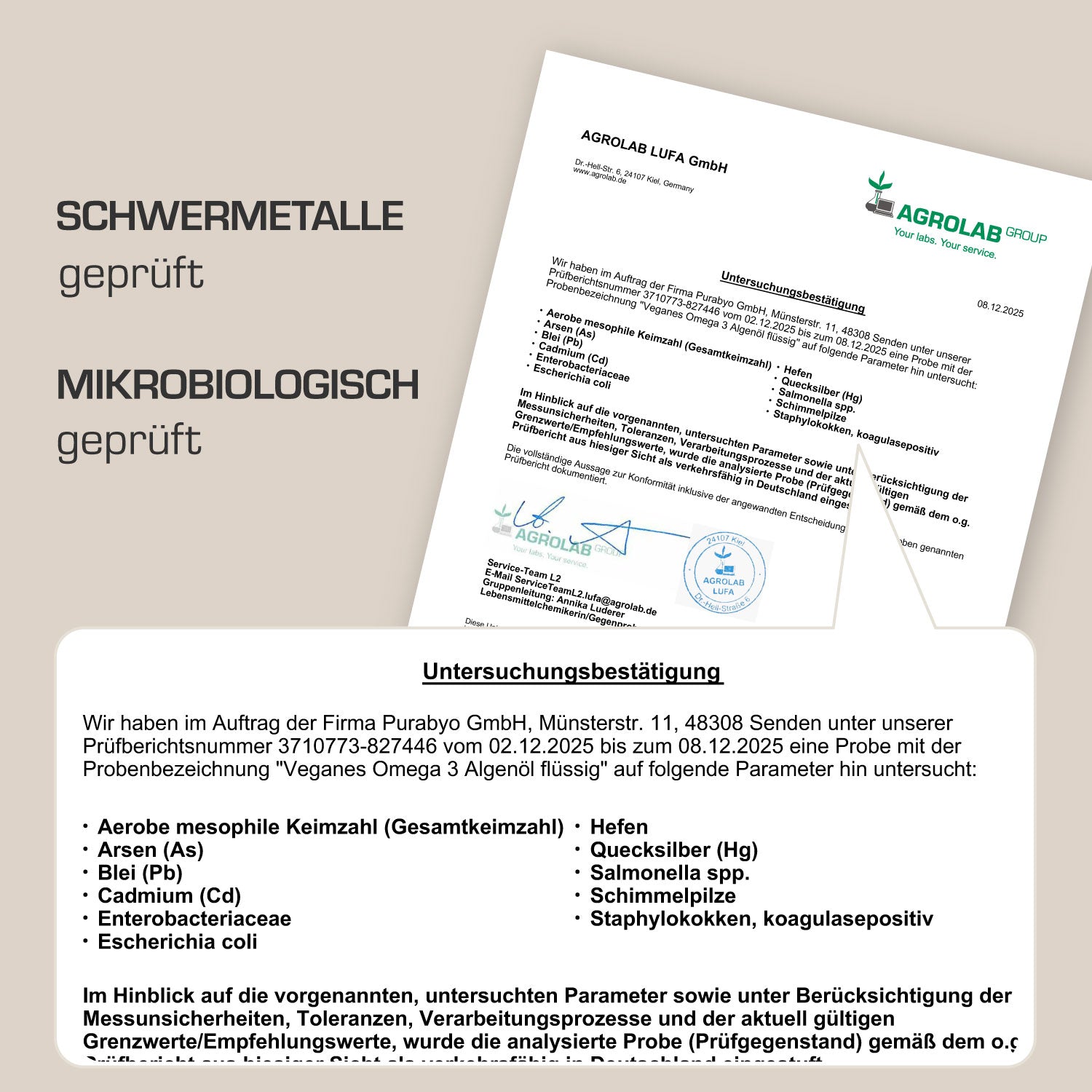 Purabyo Omega-3 Algenöl ist hergestellt in Deutschland und jede Charge wird von einem unabhängigen Labor auf Schwermetalle und Mikrobiologie geprüft.