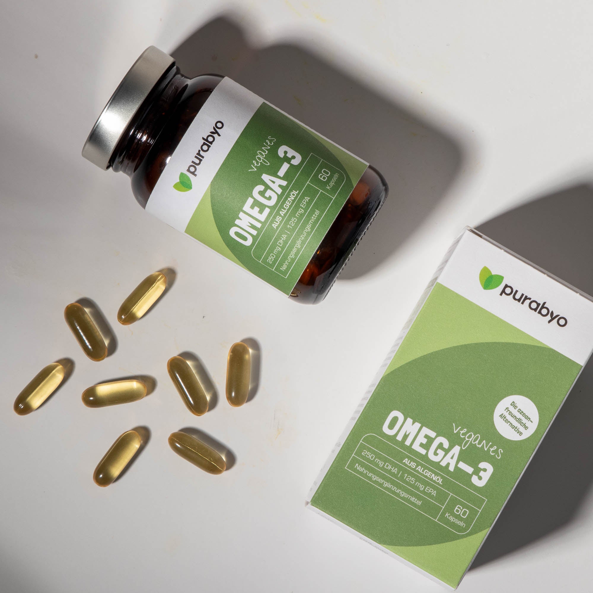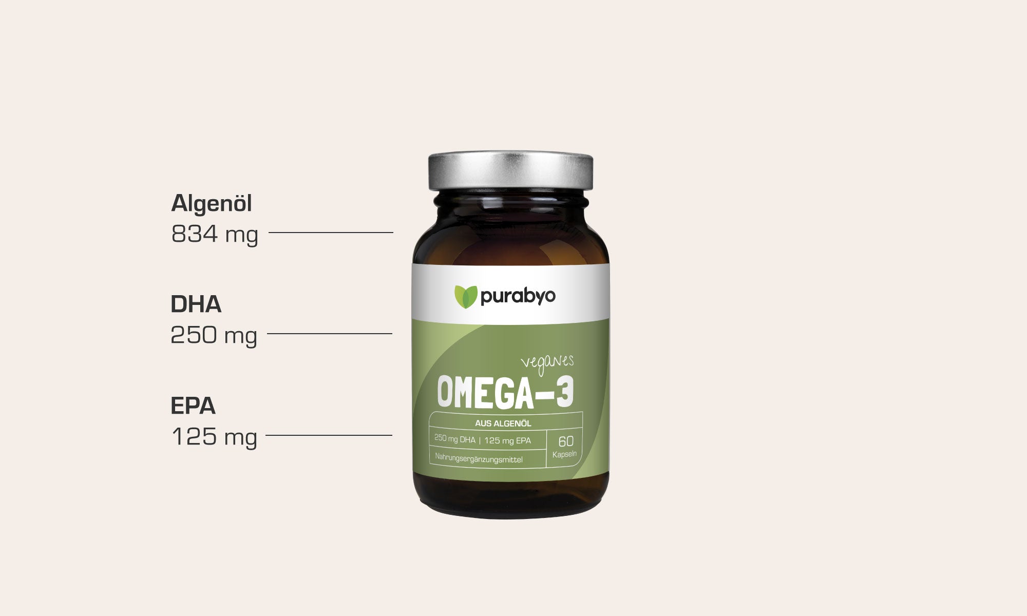 Veganes Omega-3 von Purabyo enthält die mehrfach ungesättigten Ω-3-Fettsäuren Eicosapentaensäure (EPA) und Docosahexaensäure (DHA). Im Gegensatz zu vielen anderen Produkten auf dem Markt, ist neben 250 mg DHA auch EPA in einer gesundheitlich wirksamen Dosierung von 125 mg in unseren Omega-3 Algenöl Kapseln enthalten.
