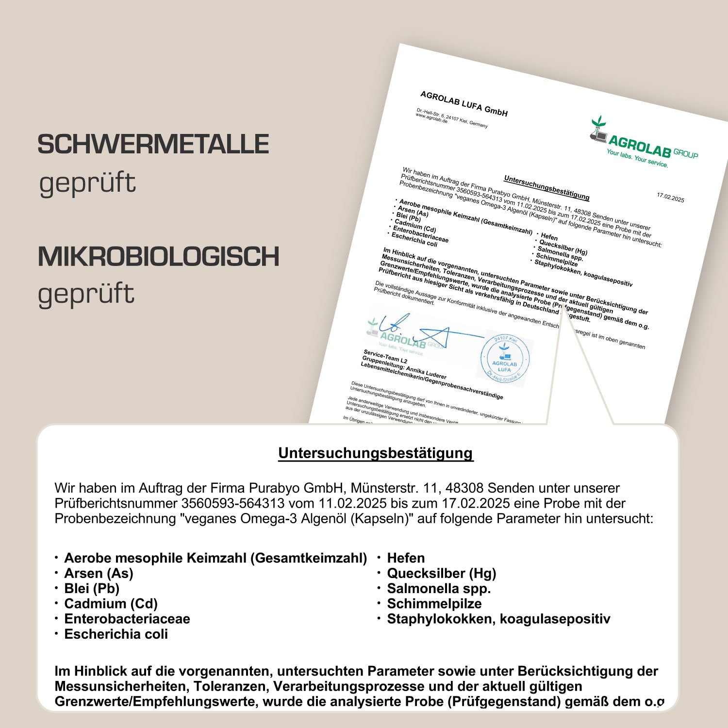 Purabyo Omega-3 Algenöl ist hergestellt in Deutschland und jede Charge wird von einem unabhängigen Labor auf aktive Inhaltstoffe (Omega-3), Schwermetalle und Mikrobiologie geprüft.