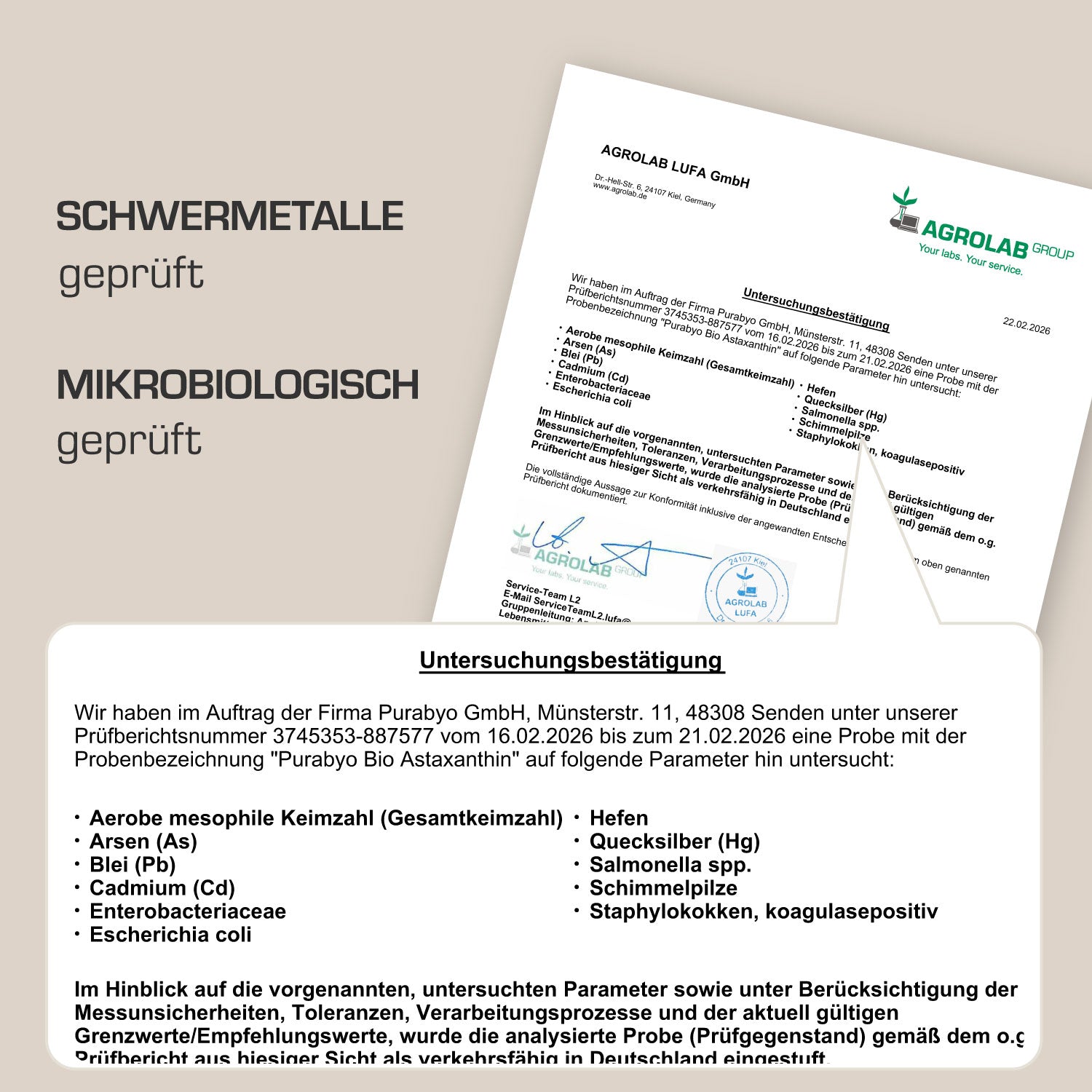 Purabyo Bio Astaxanthin ist hergestellt in Deutschland und jede Charge wird von einem unabhängigen Labor auf Mikrobiologie und Schwermetalle geprüft.