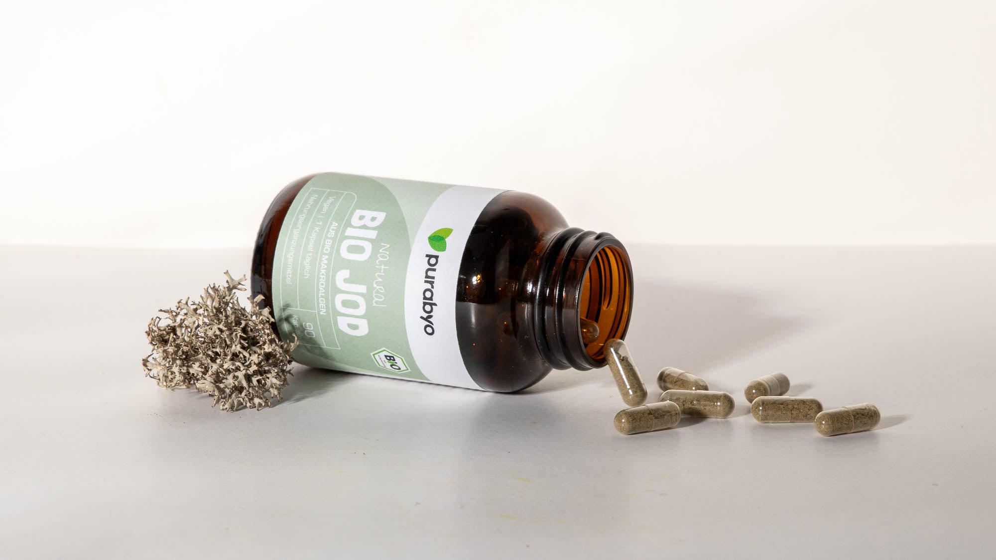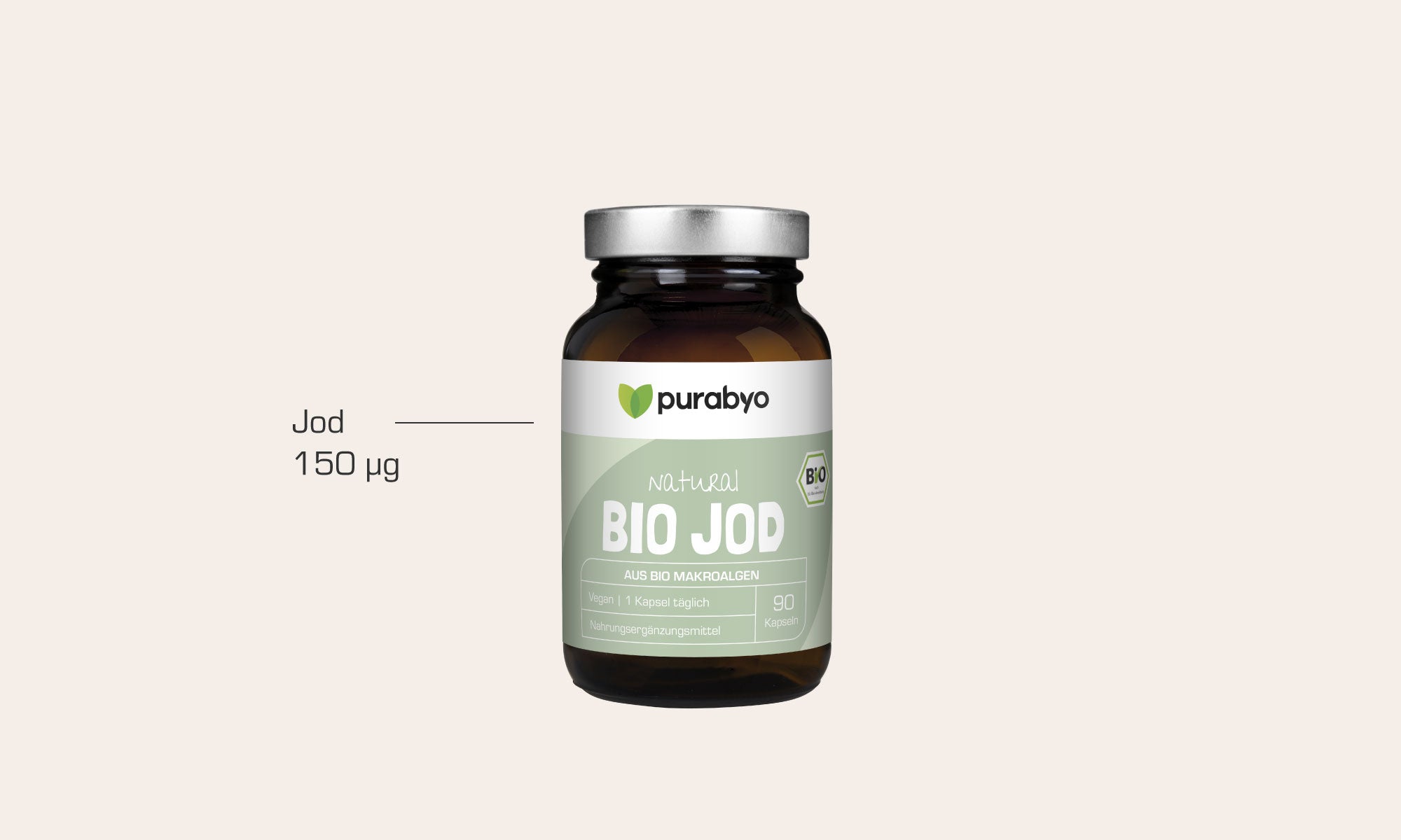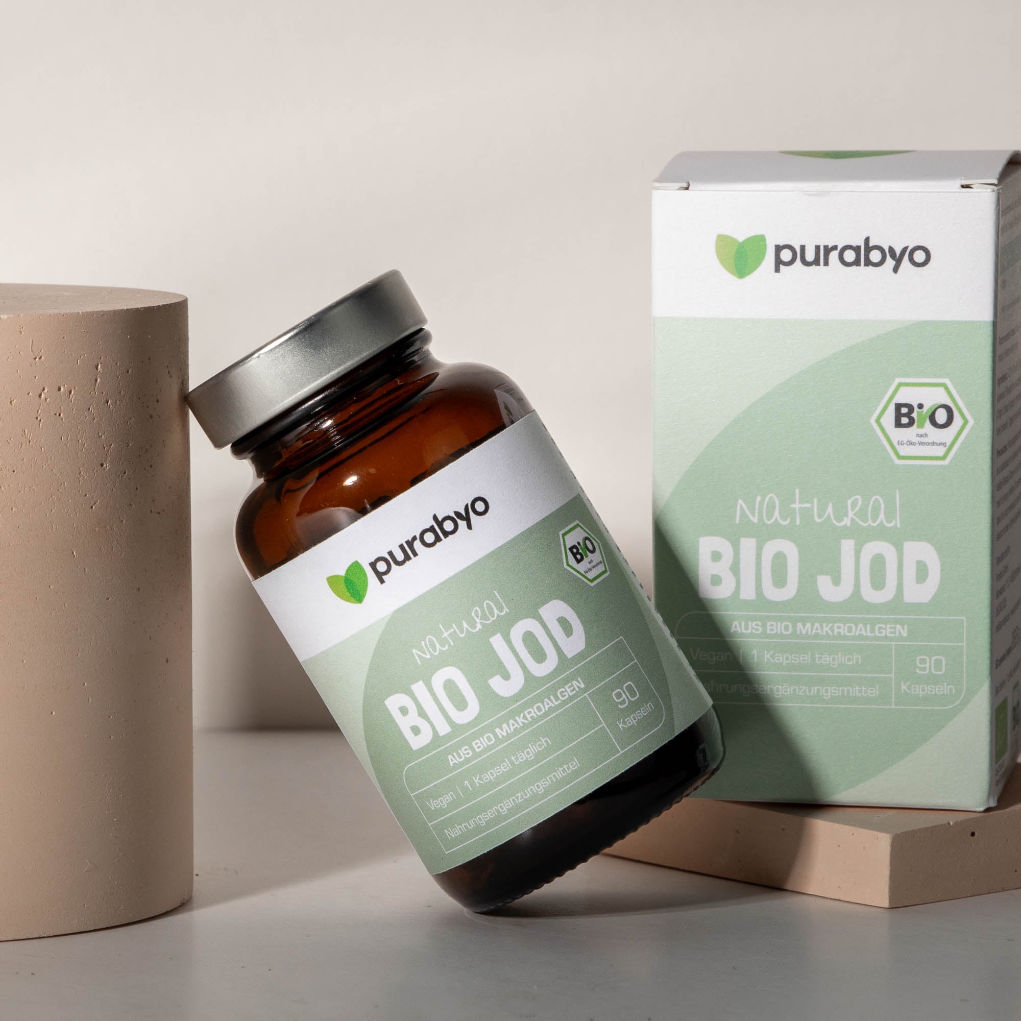 Jod ist eines der wichtigsten Spurenelemente für deinen Körper. Es ist an zahlreichen Stoffwechselprozessen beteiligt. Deutschland ist Jodmangelgebiet und die Jodversorgung der Bevölkerung ist rückläufig. Mit Bio Jod Kapseln von Purabyo sicherst du deine Versorgung mit 100% des Tagesbedarfs.