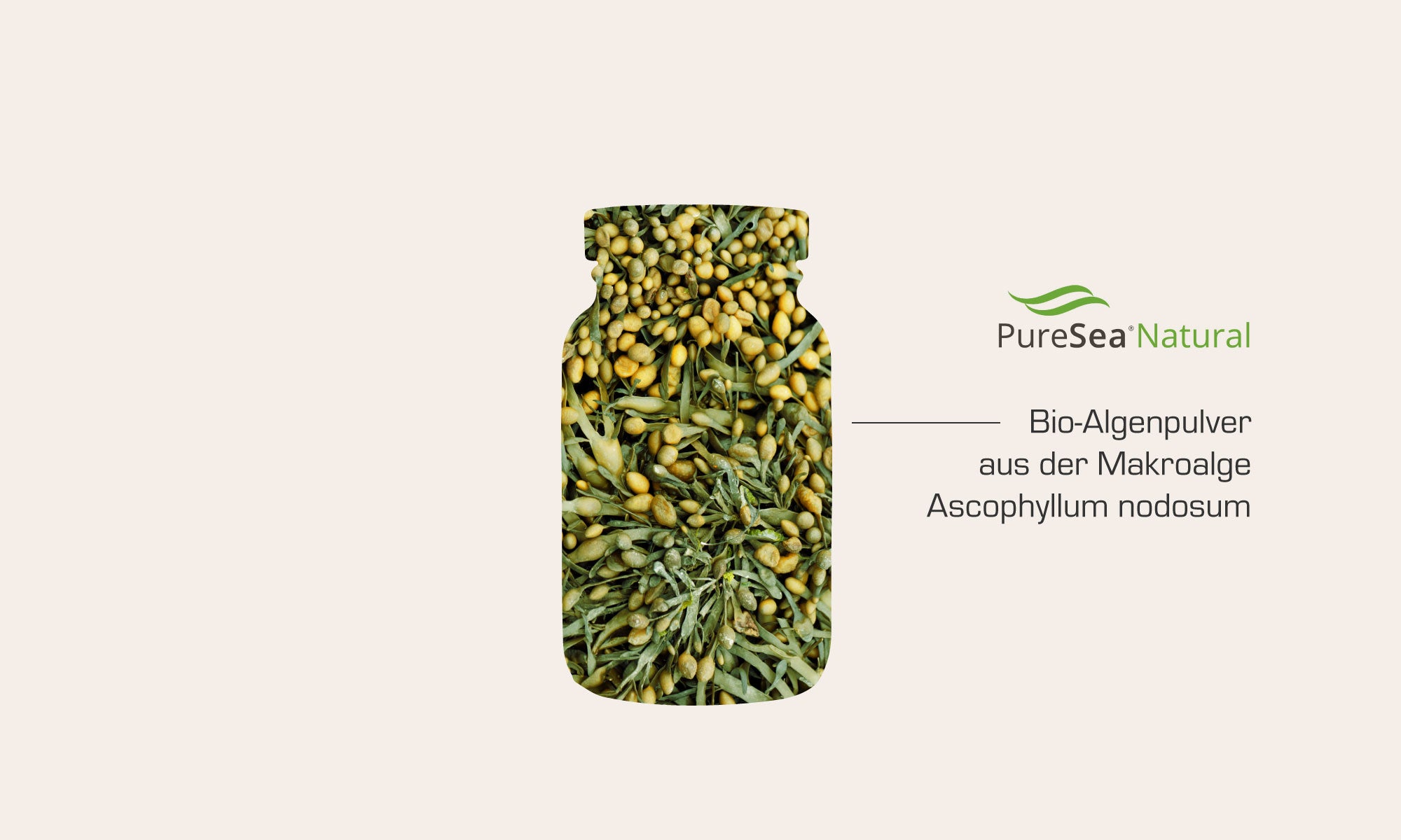 Die verwendete Makroalge Ascophyllum nodosum wird in ökologischen Aquakulturen der nördlichen Hebriden (Schottland) angebaut und geerntet. Wir verwenden den Marken-Rohstoff PureSea®Bio-Algenpulver.