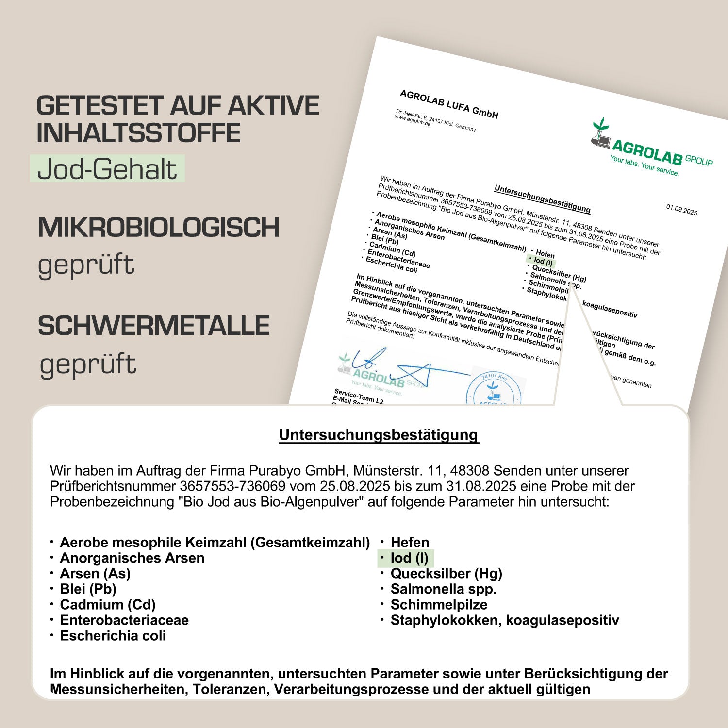 Purabyo Bio Jod ist hergestellt in Deutschland und jede Charge wird von einem unabhängigen Labor auf aktive Inhaltstoffe (Jod) und Mikrobiologie geprüft.