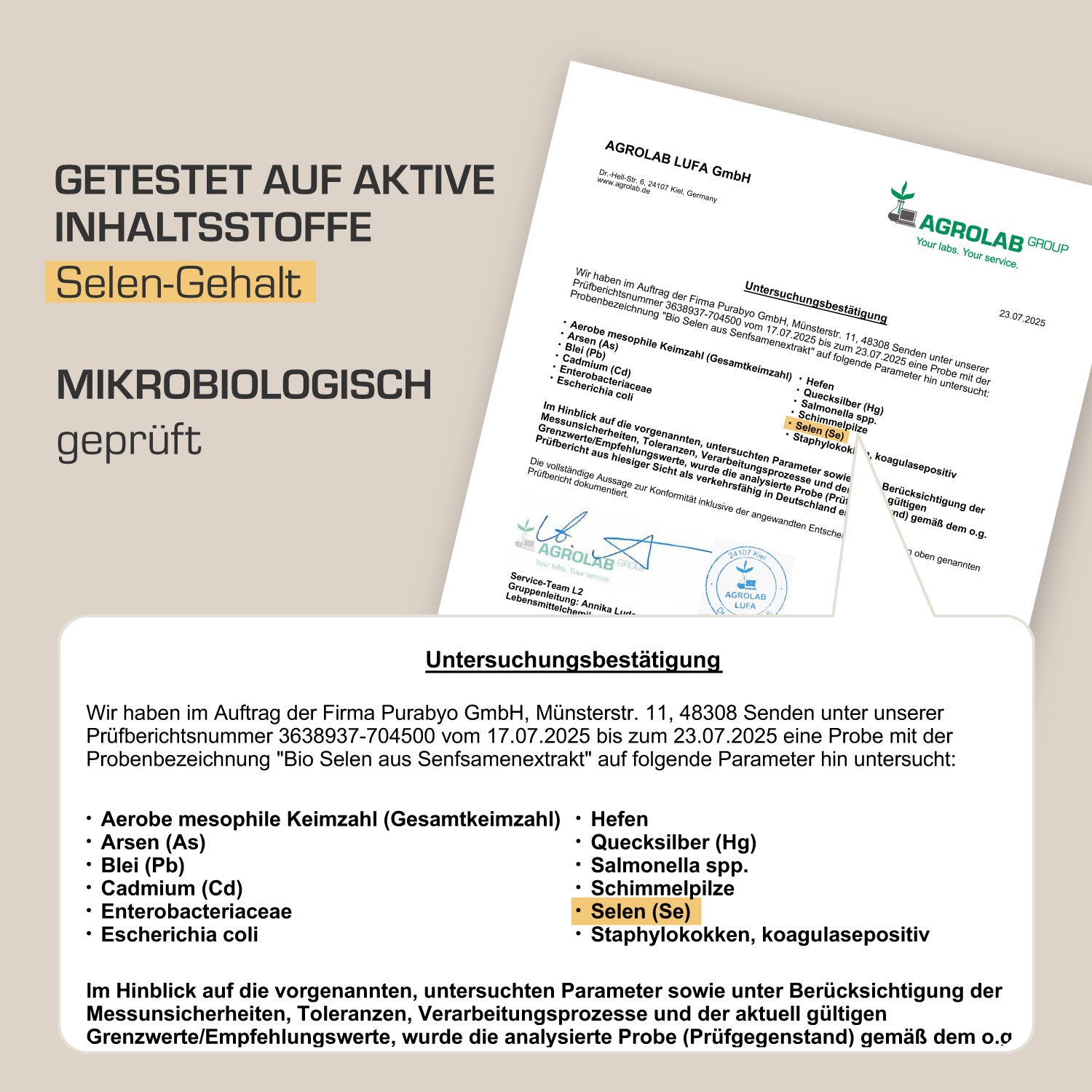 Purabyo Selen Kapseln sind hergestellt in Deutschland und jede Charge wird von einem unabhängigen Labor auf aktive Inhaltstoffe (Selen) und Mikrobiologie geprüft.