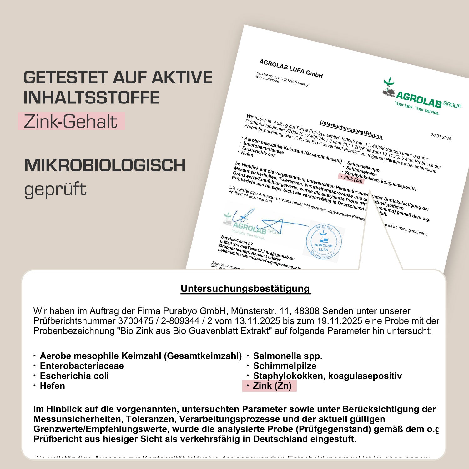 Purabyo Bio Zink ist hergestellt in Deutschland und jede Charge wird von einem unabhängigen Labor auf aktive Inhaltstoffe (Zink) und Mikrobiologie geprüft.