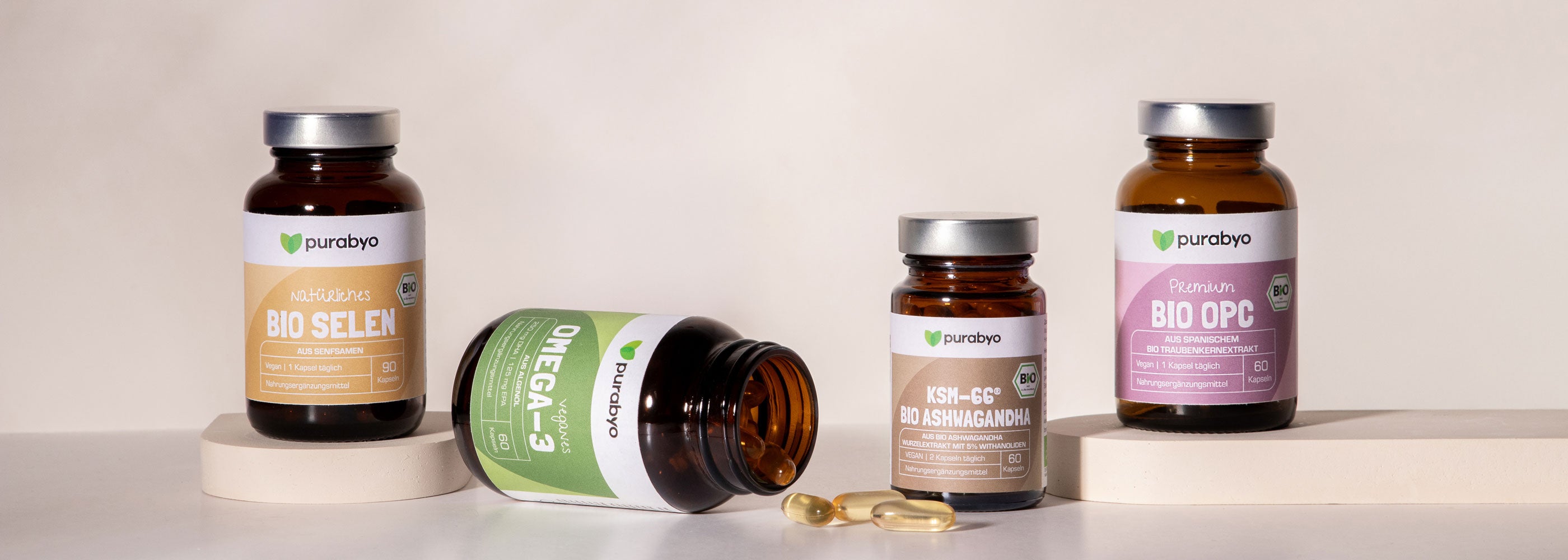Purabyo setzt auf natürliche Mikronährstoffe in ihrer ursprünglichen pflanzlichen Matrix – statt isolierter, synthetischer Zusätze. Unsere Produkte enthalten Extrakte aus Pflanzen, Algen und Früchten, die reich an Vitaminen, Mineralien und sekundären Pflanzenstoffen sind. Zudem sind sie 100% vegan, laborgeprüft, ohne unnötige Zusatzstoffe und größtenteils in Bio-Qualität – abgefüllt in nachhaltigen Braunglasflaschen.